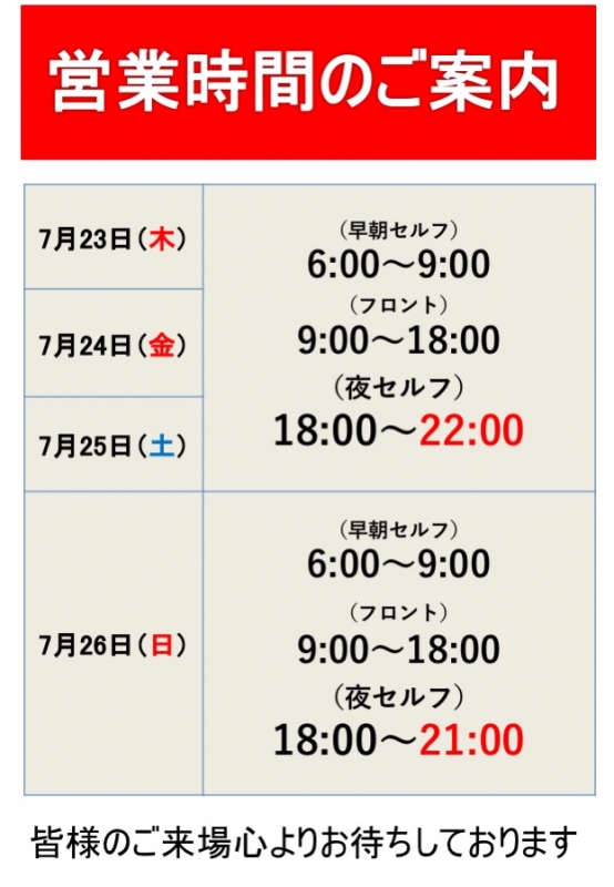 7月4連休の営業時間のご案内