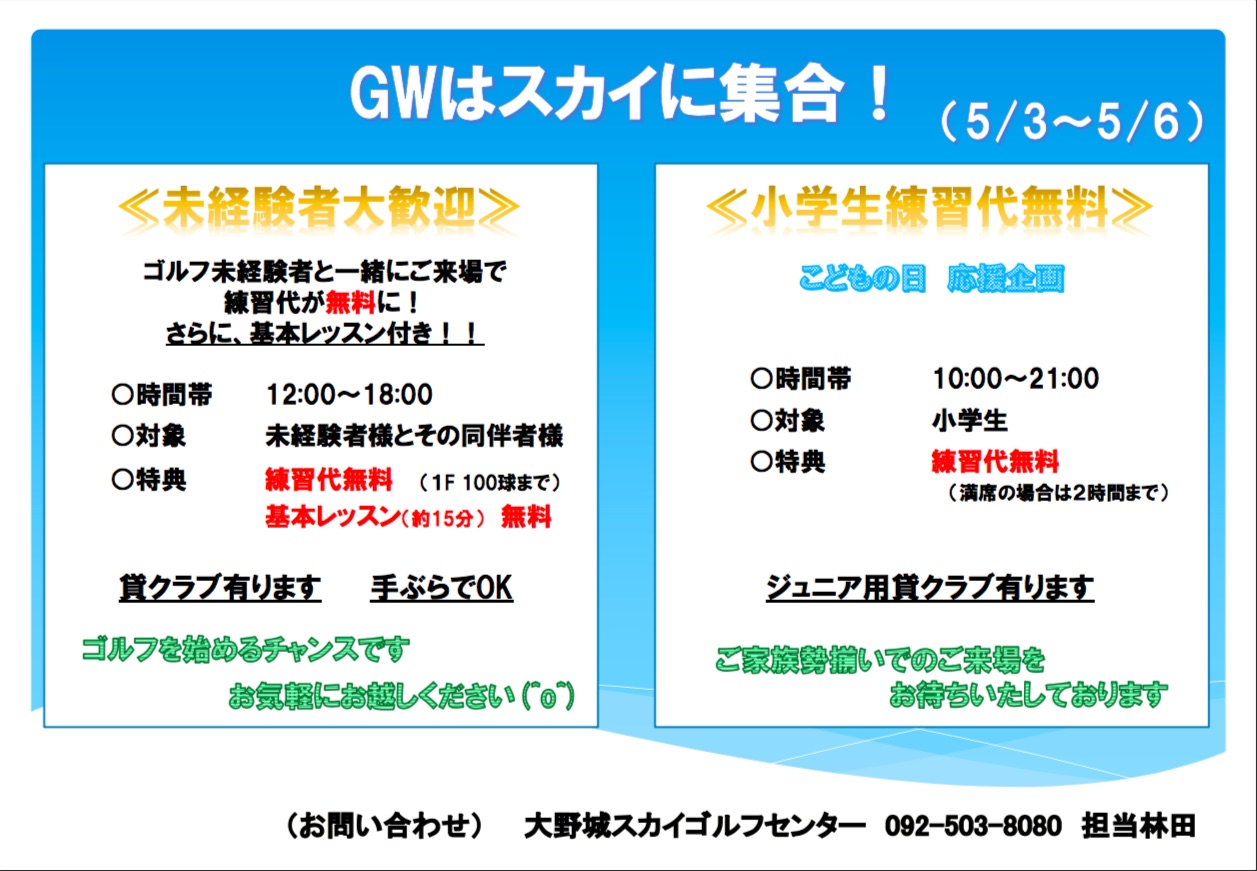 スカイのゴールデンウイークは、ゴルフ未経験者様を応援します❗️